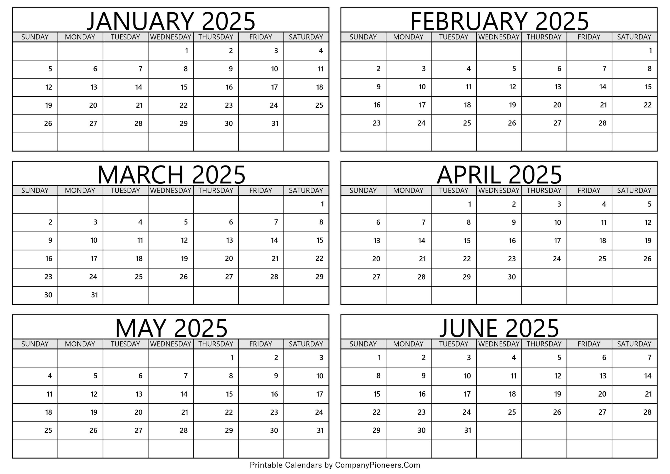 January To June 2025 Printable Calendar Six Months Per Page Printable Calendar